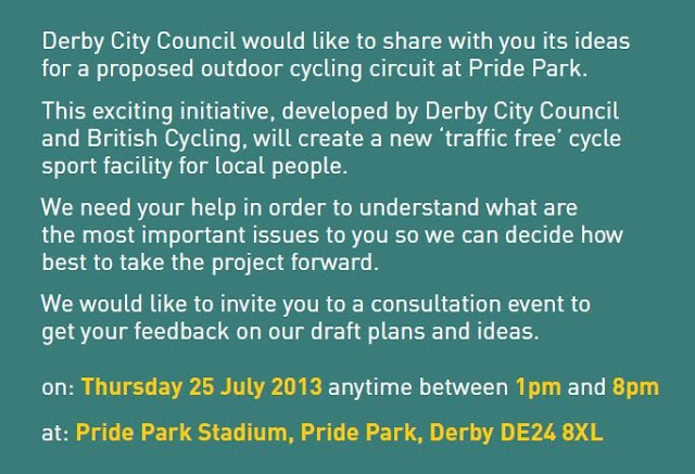 If you are free, please try and visit Pride Park stadium on Thursday 25th July in order to give your views on the closed cycle circuit planned to be built next to the multi-sports stadium.