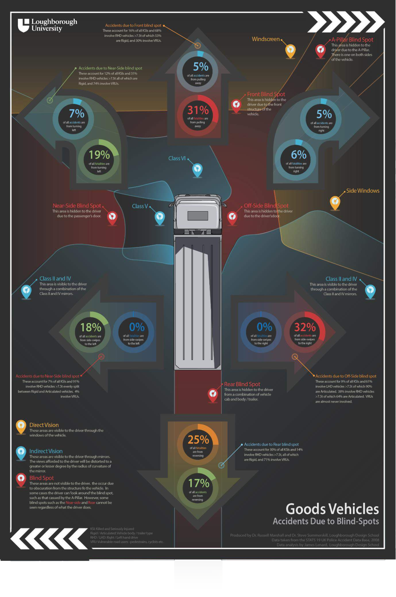 Loughborough University have done a lot of research on behalf of the DfT (see this link for full details) including the chart on the left showing the areas that drivers can see directly, those they can see in their mirrors, and those that are invisible.