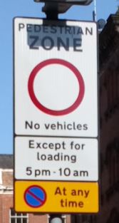 A bicycle is a vehicle and is therefore prohibited from this street unless delivering or picking up items to an address on the street, or an address accessed from it, between the times shown. In Derby many of these streets are one-way, and there is no cycle exception to this.