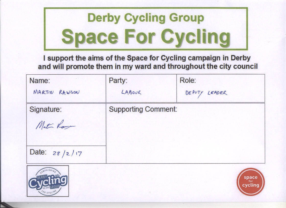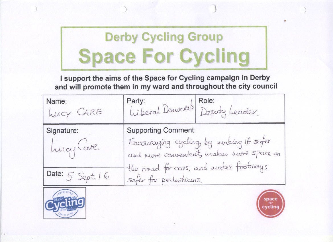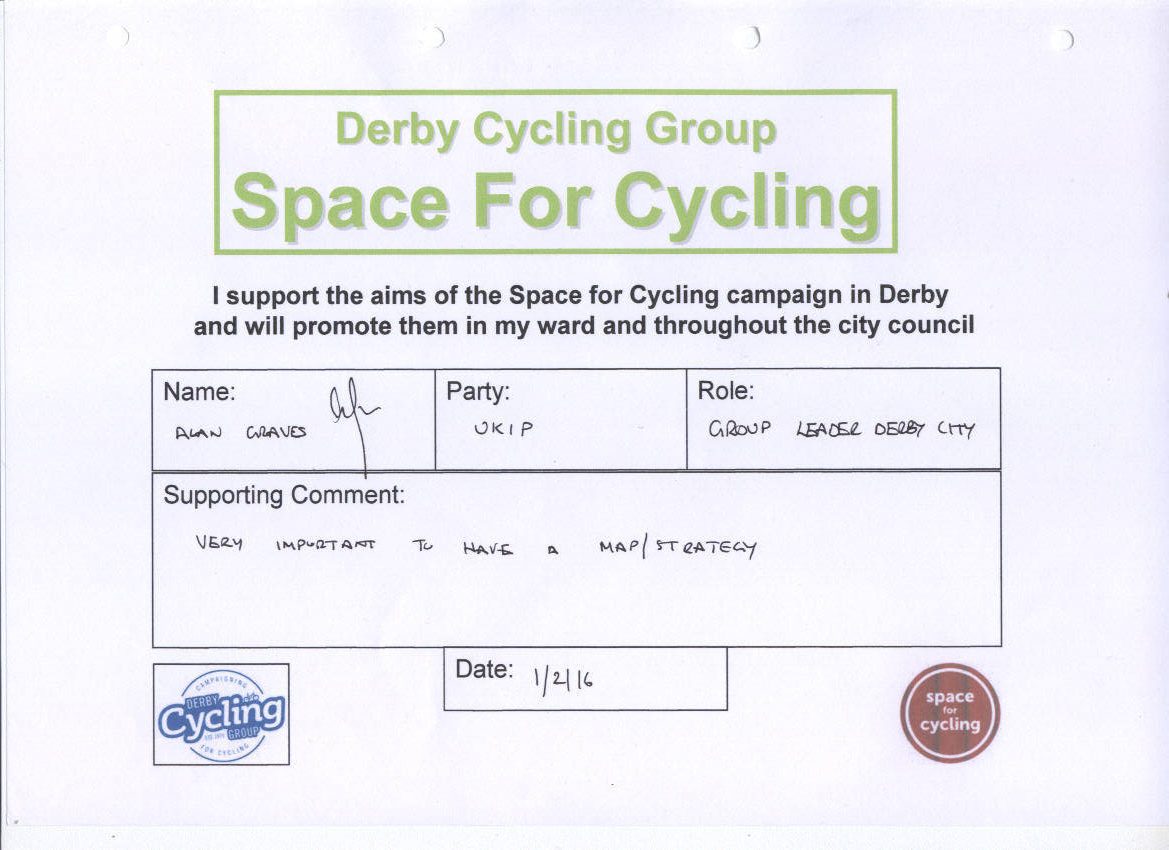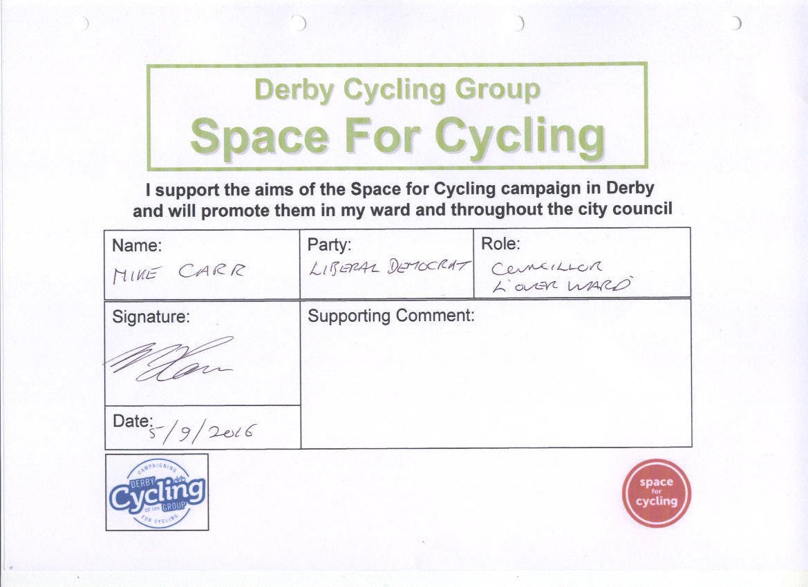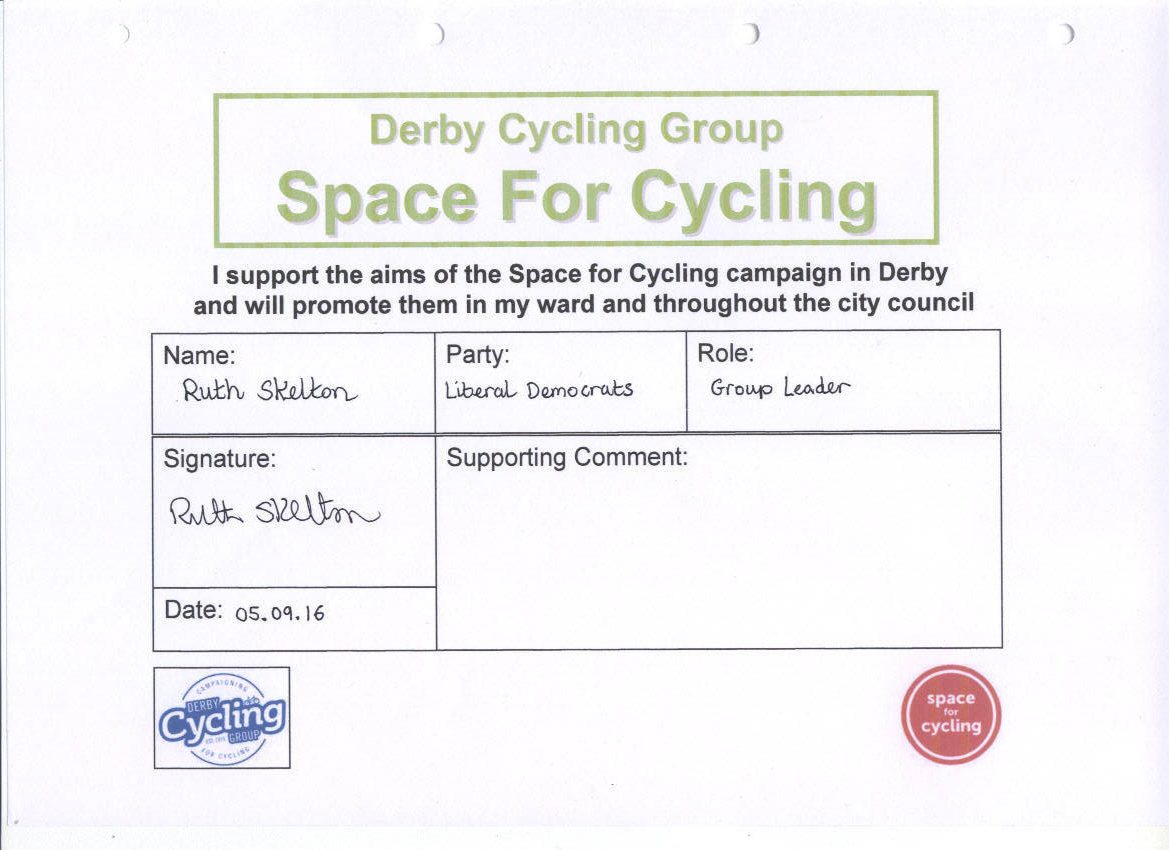 We’ve been asking the political parties in Derby to support the Space for Cycling campaign. The response from the parties is shown below: